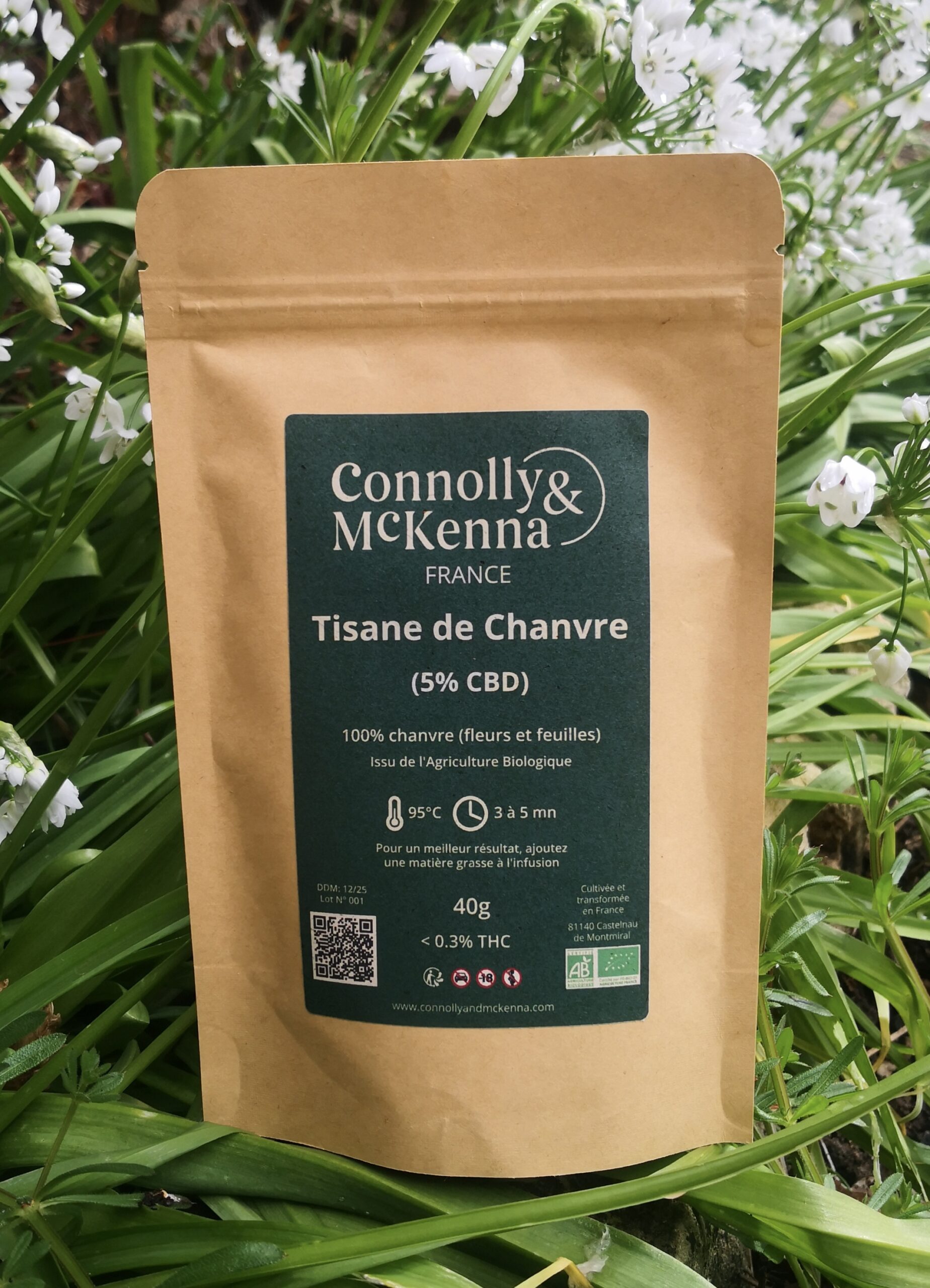 Découvrez notre tisane de CBD biologique, élaborée à partir de fleurs et feuilles de chanvre à spectre complet contenant 5 % de CBD (< 0,3 % THC).